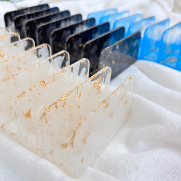 Przekładki wykonane są ręcznie z żywicy epoksydowej. Każda sztuka powstaje indywidualnie, dlatego nie ma dwóch identycznych egzemplarzy – różnią się układem wzorów, odcieniami i drobnymi detalami.