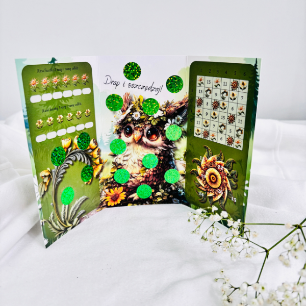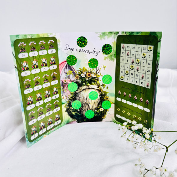 Książeczki wykonane są z wysokiej jakości papieru, foliowane i wielokrotnego użytku, co sprawia, że możesz korzystać z nich wiele razy, odkrywając kolejne etapy swojej finansowej przygody. Motyw leśnych skrzatów dodaje uroku i sprawia, że oszczędzanie staje się prawdziwą zabawą.