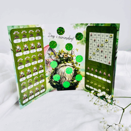 Wyzwania książeczkowe z motywem leśnych skrzatów to idealny sposób na odkładanie pieniędzy w wyjątkowy, bajkowy sposób. Każda książeczka łączy w sobie różnorodne zadania, takie jak zamalowywanie kwot, zdrapki i status finansowy, które pozwalają śledzić Twoje postępy.