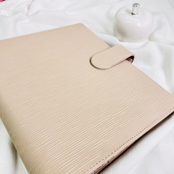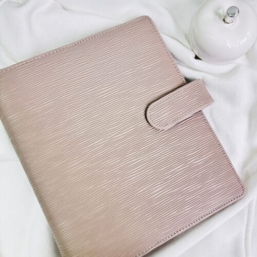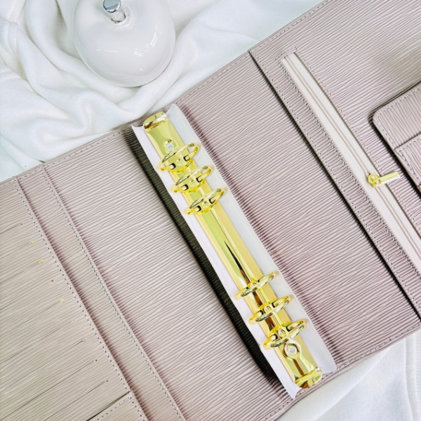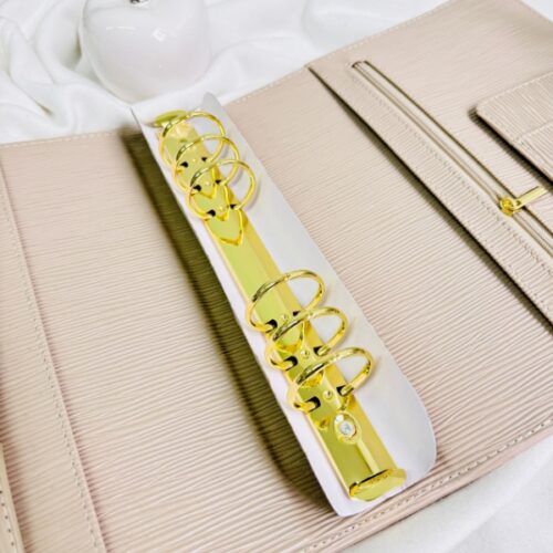 Wyposażony w duże, złote ringi zapewnia dużo miejsca na Twoje karty, wyzwania czy notatki. Dodatkowo ma praktyczne miejsce na zamek, co pozwala przechowywać drobiazgi zawsze pod ręką. Subtelne, ale efektowne okucie ze skórki nadaje mu wyjątkowego charakteru, sprawiając, że segregator prezentuje się niezwykle uroczo i kobieco.