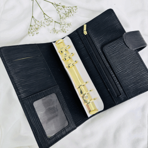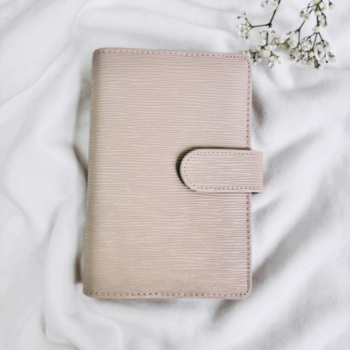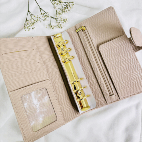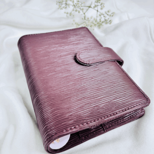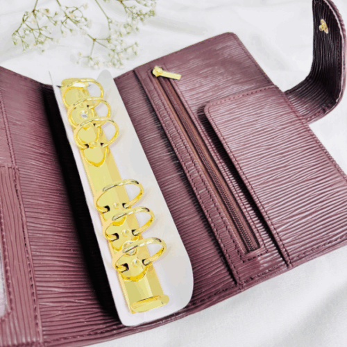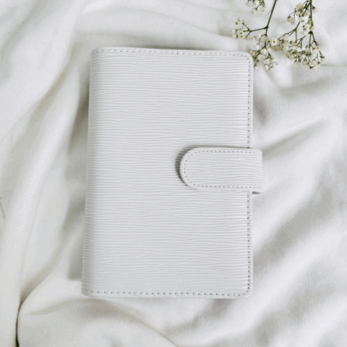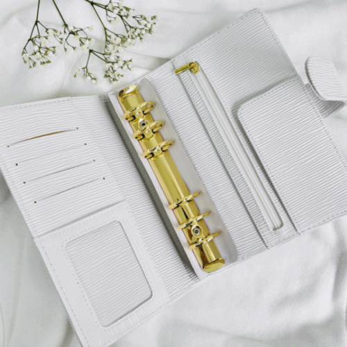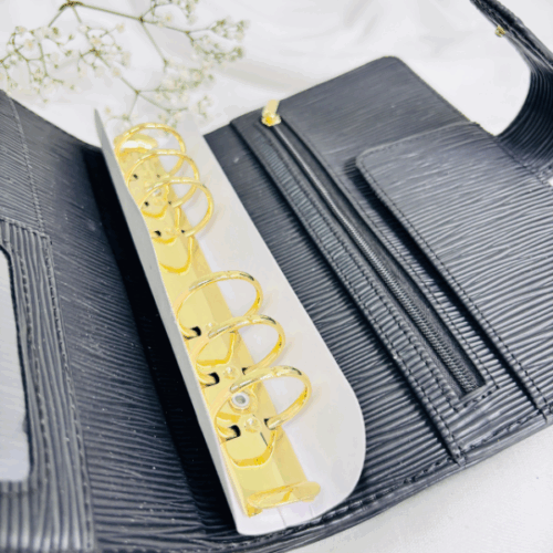 Wyposażony w duże, złote ringi zapewnia dużo miejsca na Twoje karty, wyzwania czy notatki. Dodatkowo ma praktyczne miejsce na zamek, co pozwala przechowywać drobiazgi zawsze pod ręką. Subtelne, ale efektowne okucie ze skórki nadaje mu wyjątkowego charakteru, sprawiając, że segregator prezentuje się niezwykle uroczo i kobieco.