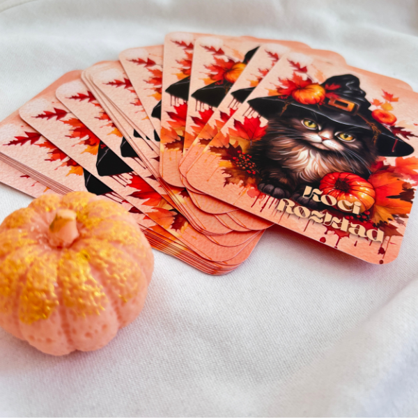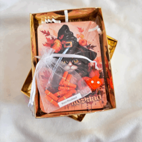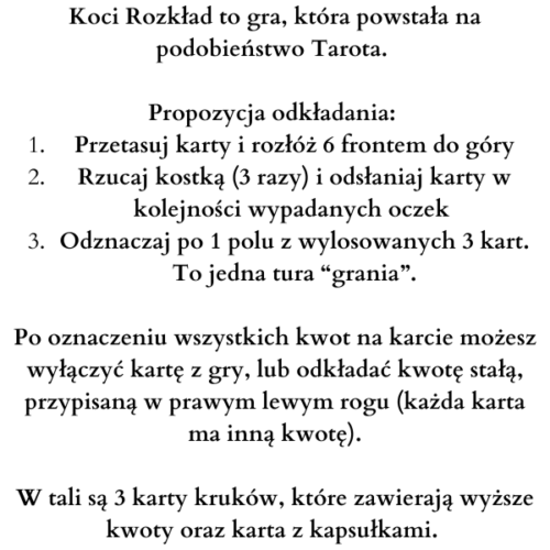 Gra „Koci Rozkład” składa się z 20 dużych kart foliowanych, kapsułek i kostki, całość oprawiona w piękne złote pudełko.