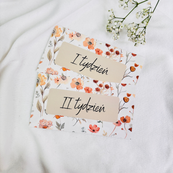 Dwie beżowe karty kategorii z napisami „I tydzień” i „II tydzień”, ozdobione kwiatowym wzorem w odcieniach pomarańczu i beżu, leżące na białym tle obok białych kwiatów.Karty kategorii Tygodniowe Beż, Edycja Wildflowers