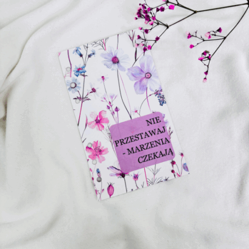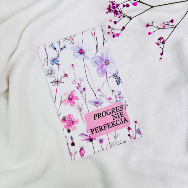 Okładki dostępne są w dwóch wariantach napisu: „Progres nie perfekcja” oraz „Nie przestawaj – marzenia czekają”. Każdy wariant występuje w rozmiarze A5 i A6, dzięki czemu dopasujesz go do swojego segregatora.