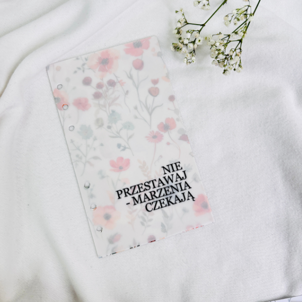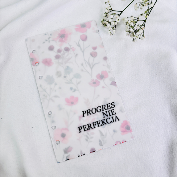 Okładka do segregatora z napisem „PROGRES NIE PERFEKCJA” i delikatnym wzorem kwiatów w ciepłych odcieniach na białym tle.Okładki matowe a5 i a6 do segregatorów Beż, Edycja Wildflowers