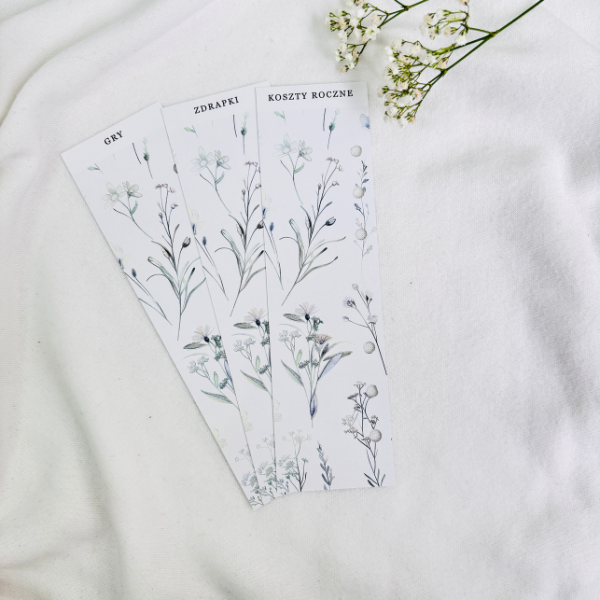 Zestaw 6 zakładek A6 do segregatora to praktyczne akcesorium do organizacji budżetu metodą kopertową. Zakładki są foliowane, dwustronne i wykonane z wysokiej jakości papieru. Każda z nich ma elegancki, kwiatowy motyw w odcieniach zieleni i bieli. W zestawie znajdziesz zakładki z napisami: Koszty zmienne, Koszty roczne, Wyzwania, Wyzwania roczne, Gry oraz Zdrapki. Dzięki dziurkom zakładki można łatwo wpiąć do segregatora i utrzymać porządek w finansach przez cały rok.