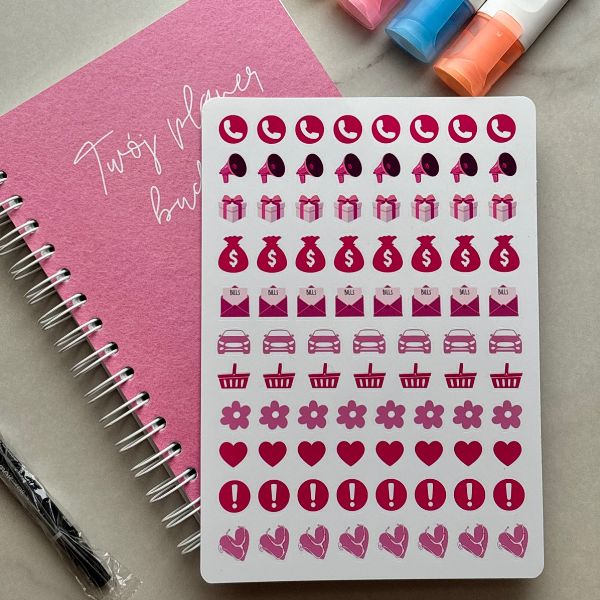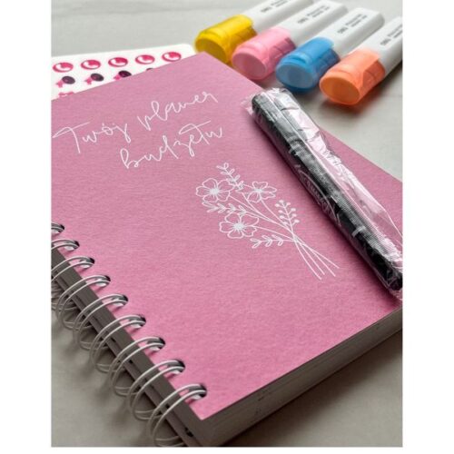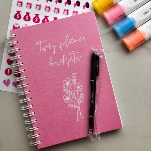 Organizer finansowy niedatowany dostępny jest w dwóch wersjach: klasycznej, gdzie dodajemy marker permanentny lub w zestawie także markerami pastelowymi – pomarańczowym, niebieskim, żółtym oraz z setem błyszczących winylowych nalepek – idealnych do oznaczania ważnych wydarzeń w planerze.