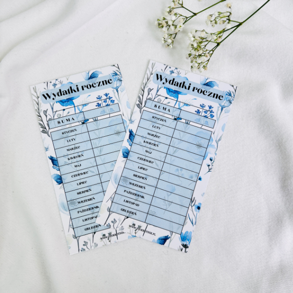Karty „Wydatki roczne” z kolekcji Wildflowers Błękit to piękne i praktyczne narzędzie, które pomoże Ci odkładać pieniądze na wydatki opłacane raz w roku, takie jak ubezpieczenie, podatki czy wakacje. Dzięki tym kartom z łatwością rozplanujesz odkładanie środków na każdą z tych kategorii przez cały rok.