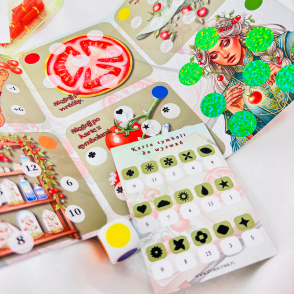 Wyzwanie powstało dzięki inspiracji społeczności. Foliowane, wielokrotnego użytku. Zawiera zwitki. Do wyzwania potrzebna jest karta symboli i kolorowa kostka.