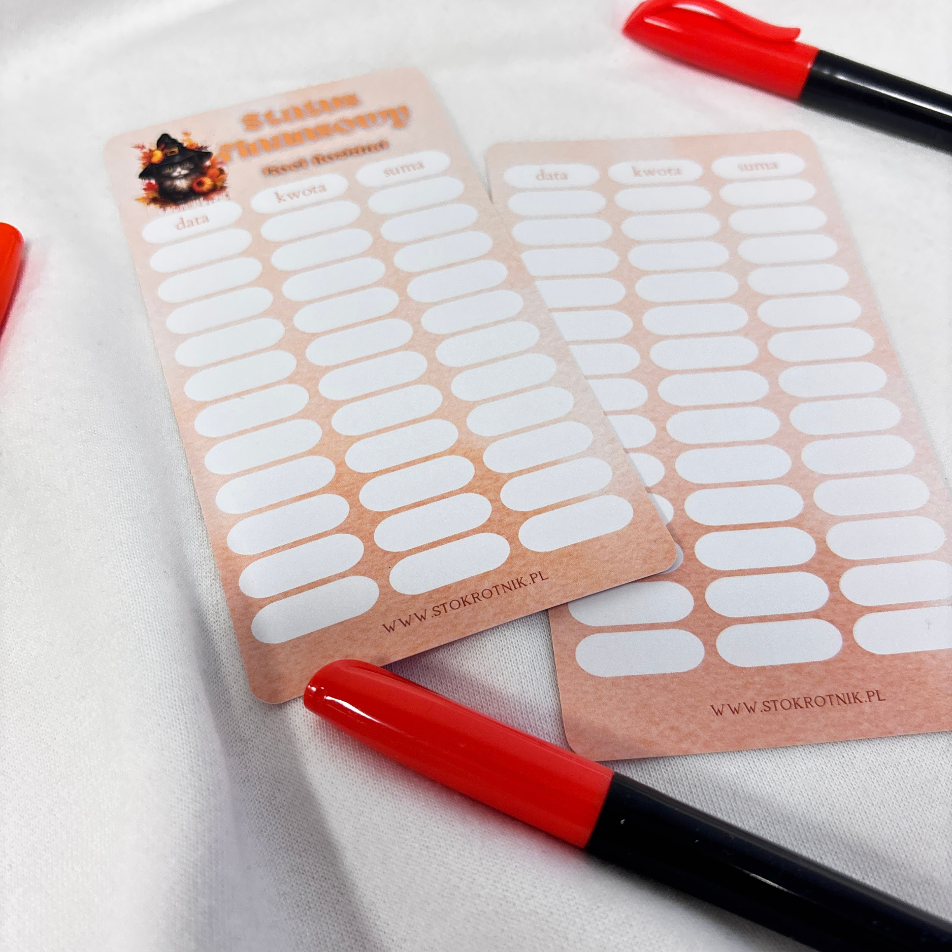 Status dwustronny do gry „Koci rozkład”. Foliowany, wielokrotnego użytku. Mieści się do koperty a6.