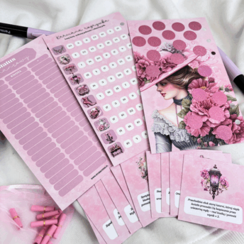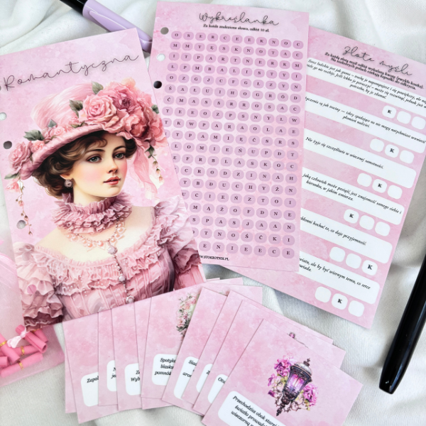Romantyczna z kartami to wpinane do segregatora A6, foliowane i wielokrotnego użytku wyzwanie, które łączy kilka form zabawy w jednym miejscu. Dzięki temu oszczędzanie staje się różnorodne, wciągające i pełne niespodzianek.